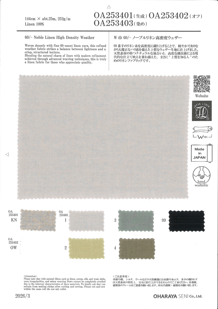 60番手の細番手リネン糸を高密度に織り上げることで、軽やかでありながらも端正なハリ感を備えた上質なウェザー生地に仕上げました。
