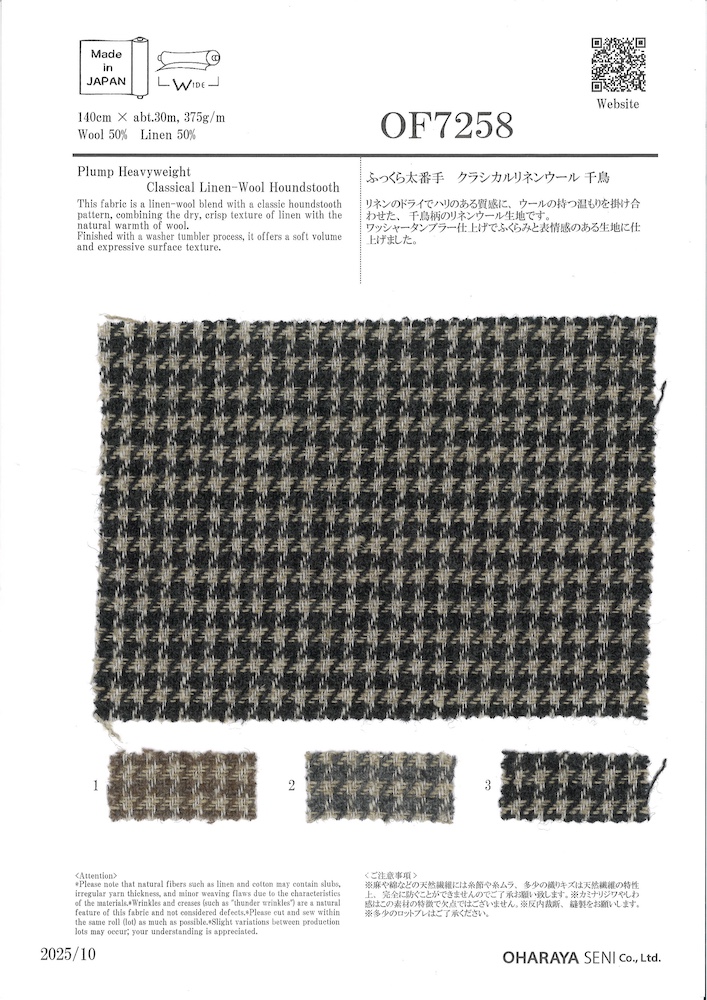 リネンのドライでハリのある質感に、ウールの持つ温もりを掛け合わせた、千鳥柄のリネンウール生地です。