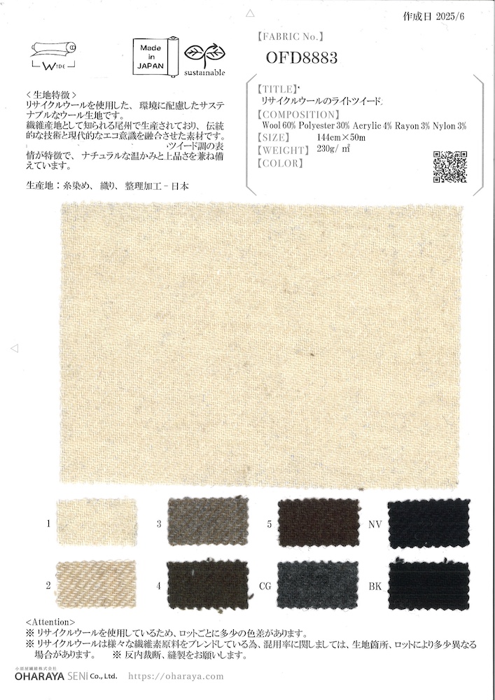 ※麻や綿、シルク、ウールなどの天然繊維には糸節や糸ムラ、多少の織りキズは天然素材の特性上、完全に防ぐことができませんのでご了承ください。 ※裁断、縫製後のクレームはご遠慮お願い致します。 ※反内裁断・縫製をお願い致します。 ※リサイクルウールを使用しているため、ロットごとに多少の色差があります。※リサイクルウールは様々な繊維素原料をブレンドしている為、混用率に関しましては、生地箇所、ロットにより多少異なる場合があります。
