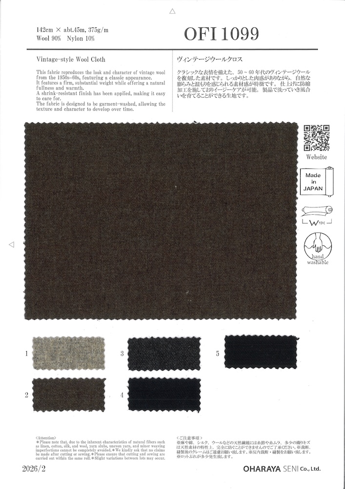 クラシックな表情を備えた、50~60年代のヴィンテージウールを復刻した素材です。しっかりとした肉感がありながら、自然な膨らみと温もりを感じられる素材感が特徴です。仕上げに防縮加工を施しておりイージーケアが可能。製品で洗っていき風合いを育てることができる生地です。