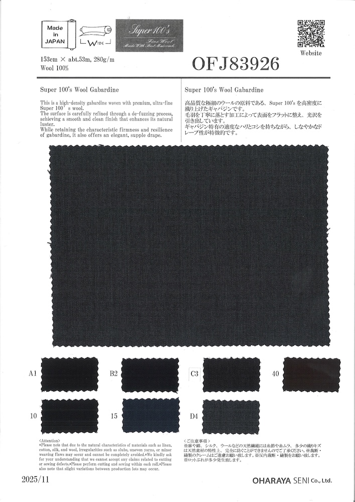 高品質な極細のウールの原料である、Super100's を高密度に織り上げたギャバジンです。 毛羽を丁寧に落とす加工によって表面をフラットに整え、光沢を引き出しています。 ギャバジン特有の適度なハリとコシを持ちながら、しなやかなドレープ性が特徴的です。 |