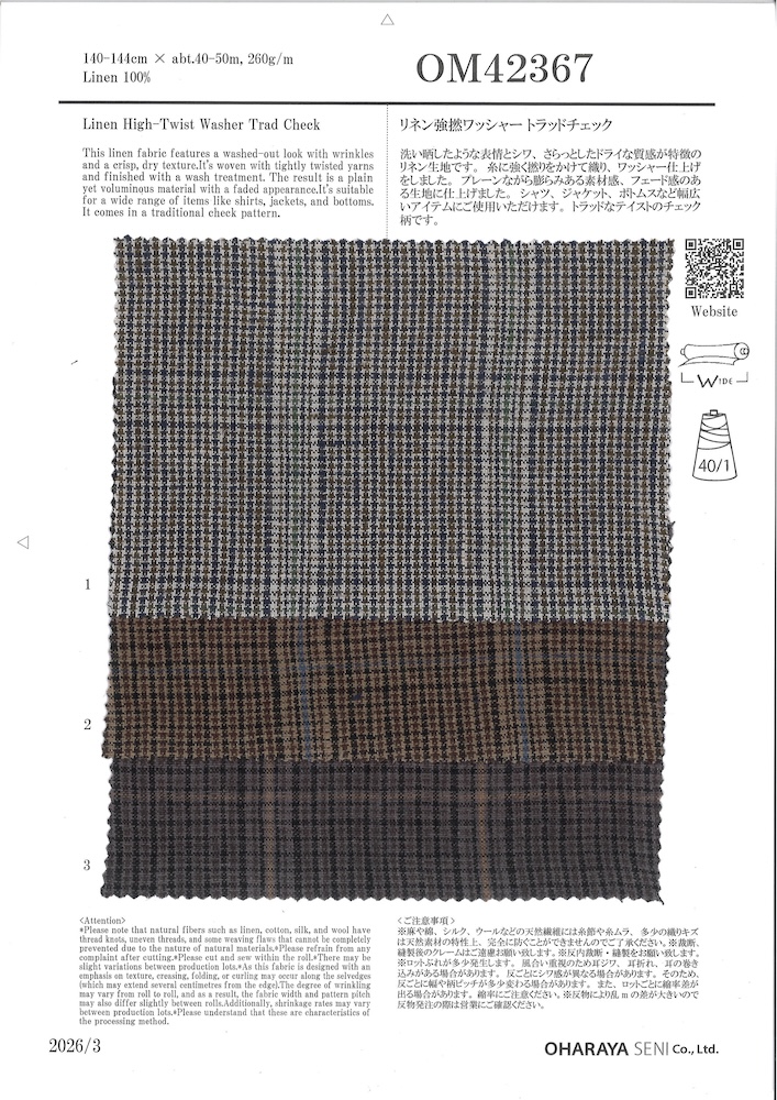 ※麻や綿、シルク、ウールなどの天然繊維には糸節や糸ムラ、多少の織りキズは天然素材の特性上、完全に防ぐことができませんのでご了承ください。 ※裁断、縫製後のクレームはご遠慮お願い致します。 ※反内裁断・縫製をお願い致します。 ※ロットぶれが多少発生致します。 ※風合い重視のため耳ジワ、耳折れ、耳の巻き込みがある場合があります。(耳付近数センチにわたりある場合があります。)