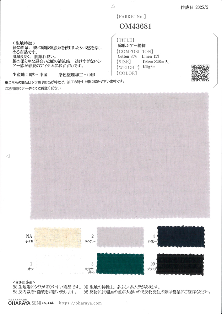 ※麻や綿、シルク、ウールなどの天然繊維には糸節や糸ムラ、多少の織りキズは天然素材の特性上、完全に防ぐことができませんのでご了承ください。 ※裁断、縫製後のクレームはご遠慮お願い致します。 ※反内裁断・縫製をお願い致します。 ※ロットぶれが多少発生致します。 ※耳端に皺が寄りやすい商品です、色、ロットにより生地幅にばらつきがございます。