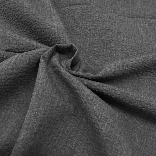 ポコポコとした表面の凹凸感により肌離れが良いサッカー生地です。程よい肉感と軽さを兼ね備えた汎用性が高い生地です。メランジ感のあるトップ糸を使用した奥行きのある表情が特徴です。単色にはない深みとニュアンスを生み出し、上品で洗練された印象を与えます。