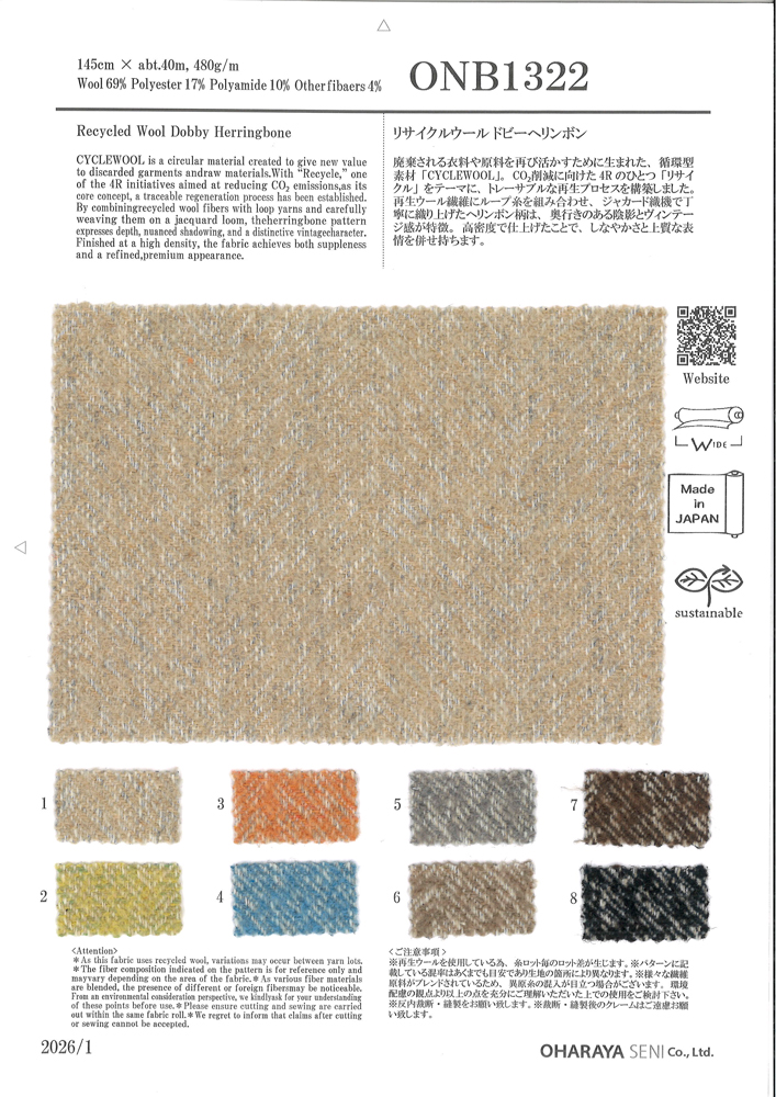 廃棄される衣料や原料を再び活かすために生まれた、循環型素材「CYCLEWOOL」。CO₂削減に向けた4Rのひとつ「リサイクル」をテーマに、トレーサブルな再生プロセスを構築しました。再生ウール繊維にループ糸を組み合わせ、ジャカード織機で丁寧に織り上げたヘリンボン柄は、奥行きのある陰影とヴィンテージ感が特徴。高密度で仕上げたことで、しなやかさと上質な表情を併せ持ちます。 |