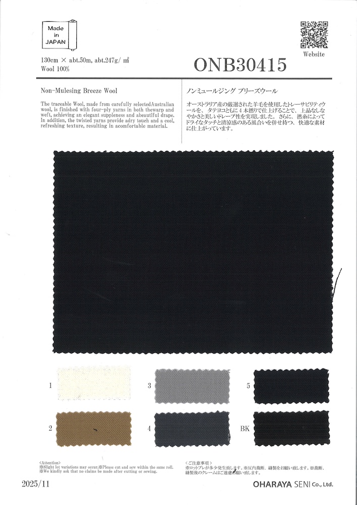 オーストラリア産の厳選された羊毛を使用したトレーサビリティウールを、タテヨコともに4本撚りで仕上げることで、上品なしなやかさと美しいドレープ性を実現しました。さらに、撚糸によってドライなタッチと清涼感のある風合いを併せ持つ、快適な素材に仕上げっています。