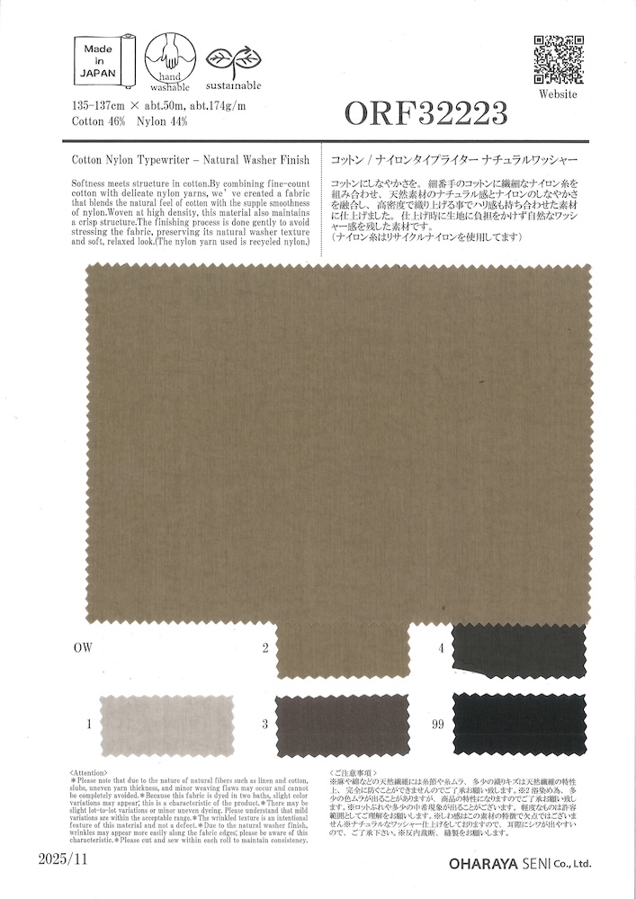 ※麻や綿、シルク、ウールなどの天然繊維には糸節や糸ムラ、多少の織りキズは天然素材の特性上、完全に防ぐことができませんのでご了承ください。 ※裁断、縫製後のクレームはご遠慮お願い致します。 ※反内裁断・縫製をお願い致します。 ※*2浴染め為、多少の色ムラが出ることがありますが、商品の特性になりますのでご了承お願い致します。*ロットぶれや多少の中希現象が出ることがございます。軽度なものは許容範囲としてご理解をお願いします。*しわ感はこの素材の特徴で欠点ではございません*ナチュラルなワッシャー仕上げをしておりますので、耳際にシワが出やすいので、ご了承下さい。