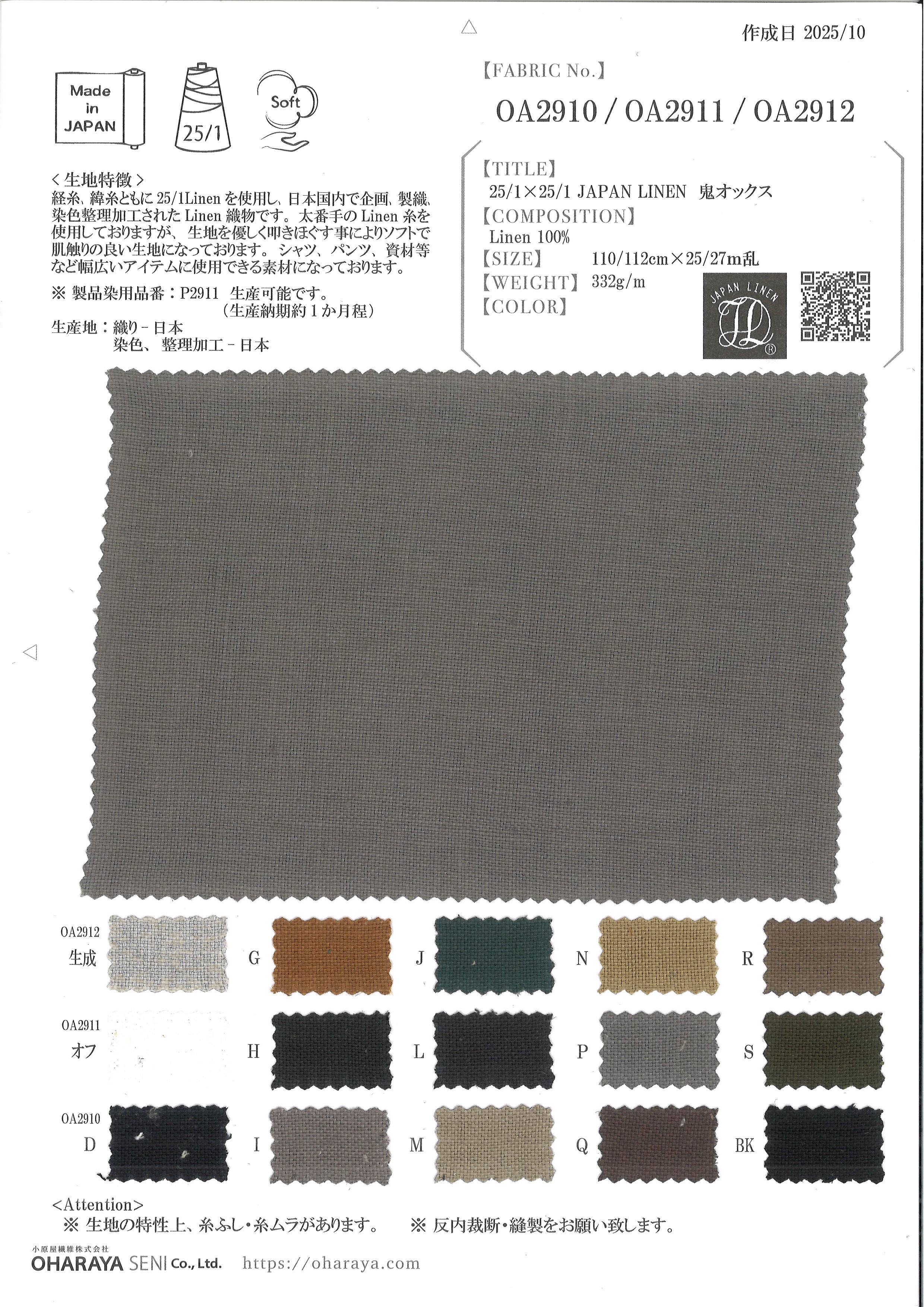 ※麻や綿、シルク、ウールなどの天然繊維には糸節や糸ムラ、多少の織りキズは天然素材の特性上、完全に防ぐことができませんのでご了承ください。 ※裁断、縫製後のクレームはご遠慮お願い致します。 ※反内裁断・縫製をお願い致します。 ※摩擦等により白化現象(アタリ、こすれが白く出る)がある場合があります。 ※OA2912が生成(キナリ)、OA2911がオフ、OA2910が染め(カラー)になります。