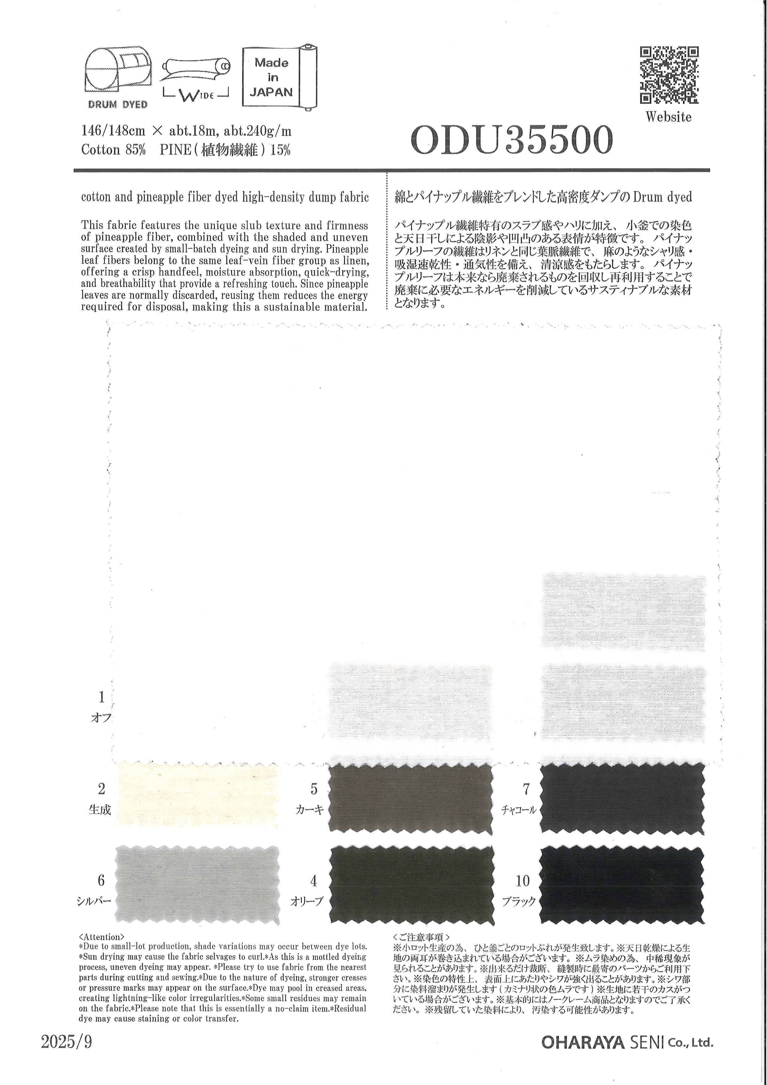 パイナップル繊維特有のスラブ感やハリに加え、小釜での染色と天日干しによる陰影や凹凸のある表情が特徴です。パイナップリーフの繊維はリネンと同じ葉脈繊維で、麻のようなシャリ感・吸湿速乾性・通気性を備え、清涼感をもたらします。パイナップルの葉は本来なら廃棄されるものを回収し再利用することで廃棄に必要なエネルギーを削減しているサスティナブルな素材となります。 |