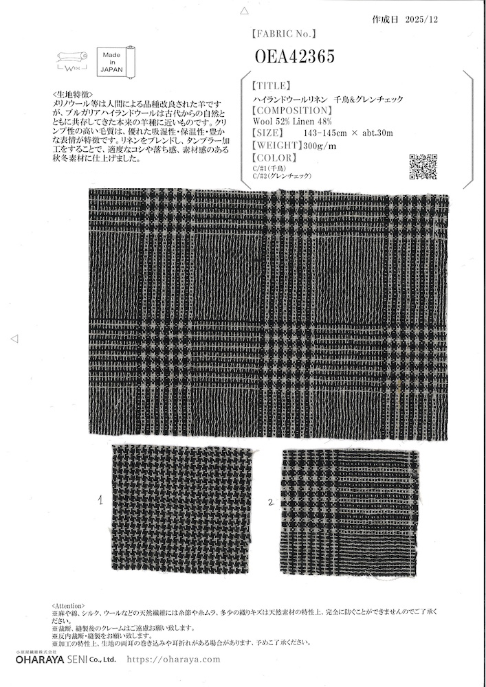 メリノウール等は人間による品種改良された羊ですが、ブルガリアハイランドウールは古代からの自然とともに共存してきた本来の羊種に近いものです。山岳地帯の昼夜の寒暖差が大きい環境に適応した毛質は、クリンプ性が高く優れた吸湿性・保温性・豊かな表情が特徴です。リネンをブレンドすることで、適度なコシや落ち感、素材差による表情のある秋冬素材となっております。タンブラー加工で素材感を引き出しました。