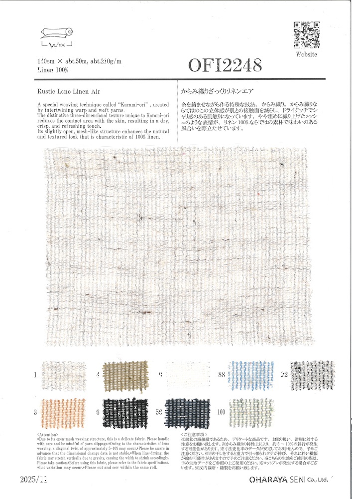 ※麻や綿、シルク、ウールなどの天然繊維には糸節や糸ムラ、多少の織りキズは天然素材の特性上、完全に防ぐことができませんのでご了承ください。 ※裁断、縫製後のクレームはご遠慮お願い致します。 ※反内裁断・縫製をお願い致します。 ※※網状の織組織であるため、デリケートな商品です。お取り扱い、滑脱に対する注意をお願い致します。※からみ織りの特性上により、約5~10%の斜行が発生する可能性があります。※寸法変化率のデータが安定しておりませんので、予めご注意ください。※吊り干しをすると重力で引っ張られタテが伸び、それに伴い横幅が縮む可能性がありますので予めご注意ください。※こちらの生地をご使用の際は、予め生地データをご参照の上ご使用ください。※ロットブレが発生する場合がございます。※反内裁断・縫製をお願い致します。