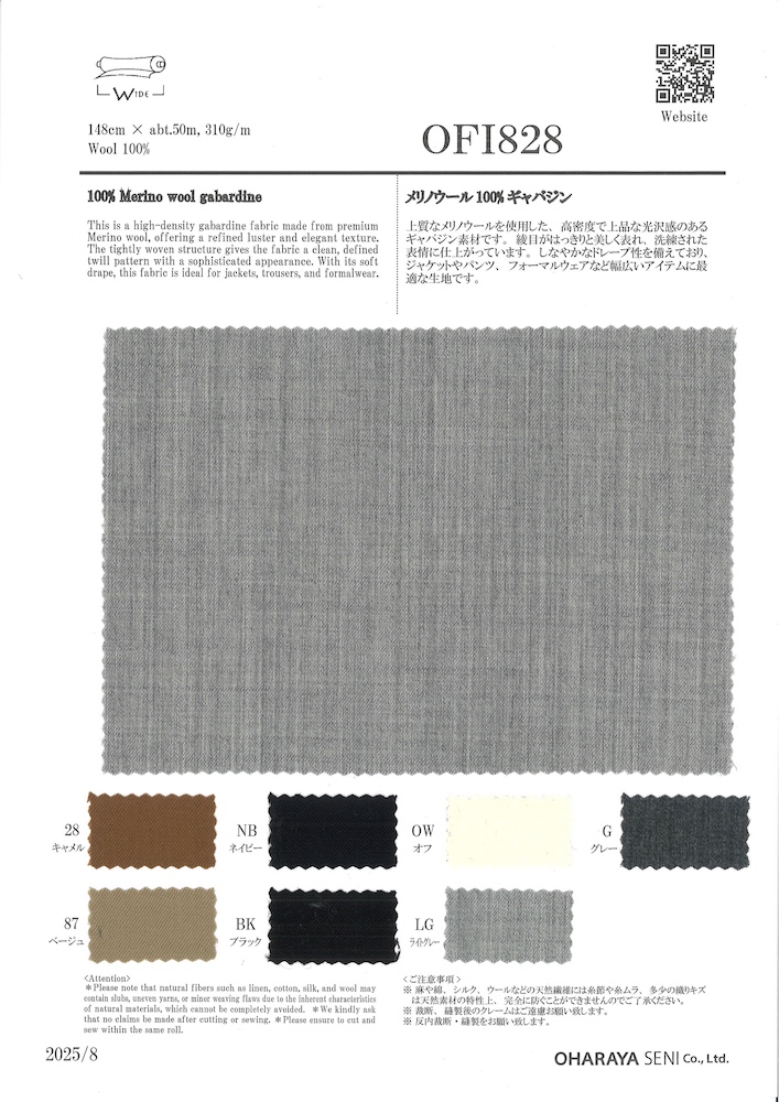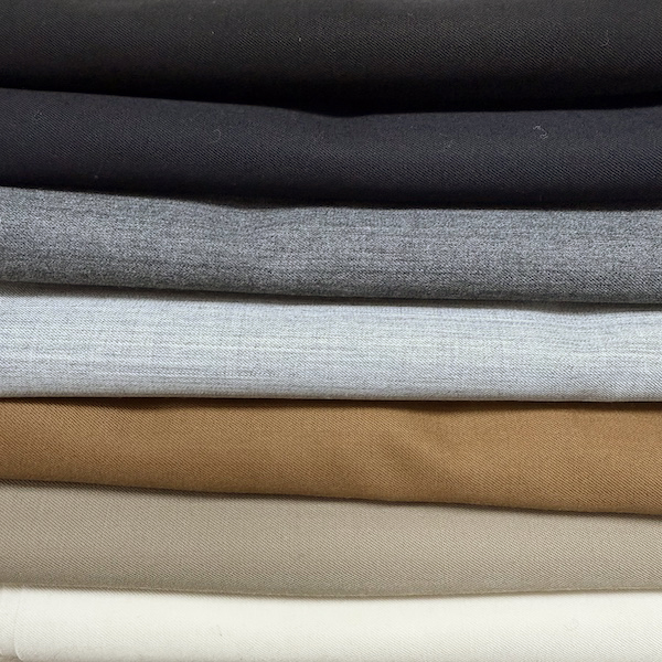 上質なメリノウールを使用した、高密度で上品な光沢感のあるギャバジン素材です。綾目がはっきりと美しく表れ、洗練された表情に仕上がっています。しなやかなドレープ性を備えており、ジャケットやパンツ、フォーマルウェアなど幅広いアイテムに最適な生地です。