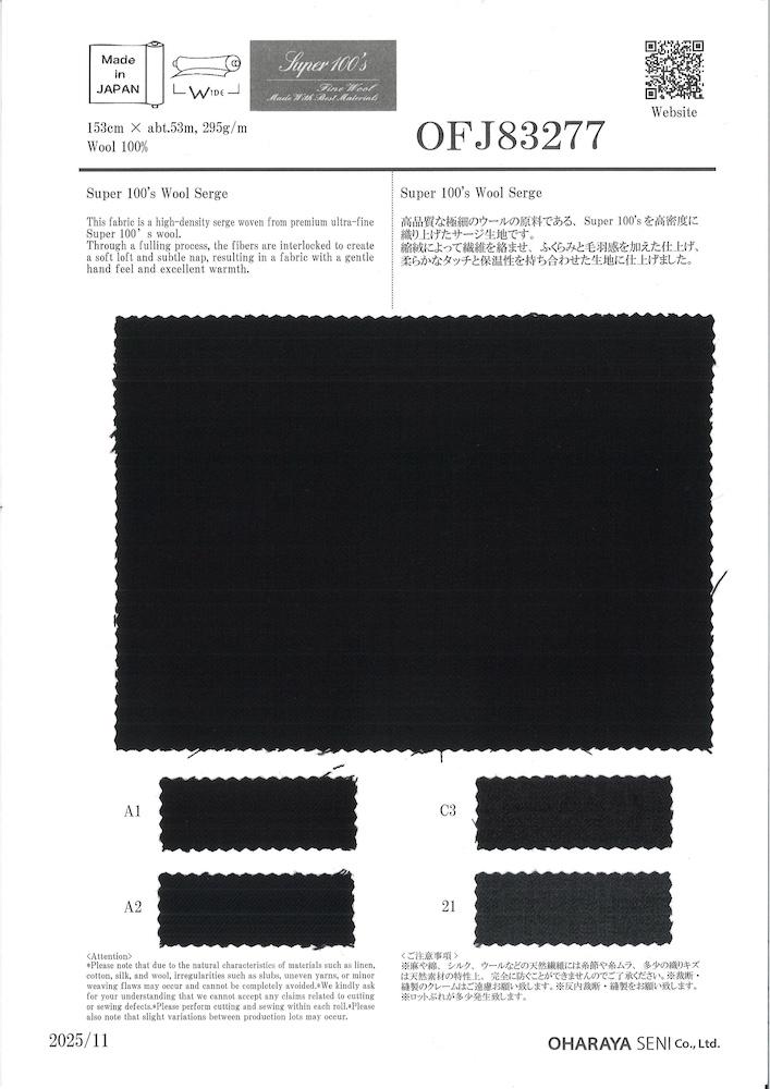 高品質な極細のウールの原料である、Super 100'sを高密度に織り上げたサージ生地です。