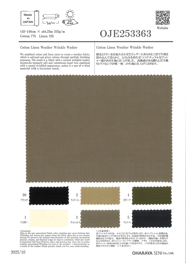 綿糸とリネン糸を組み合わせたウェザーにあらゆる工程で生地を揉み込んで柔らかく、ふくらみを持たせつつナチュラルなワッシャー感のある生地に仕上げました。