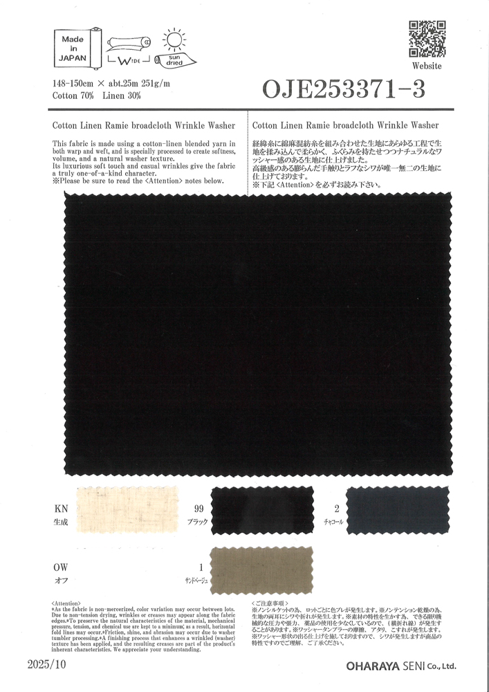※麻や綿、シルク、ウールなどの天然繊維には糸節や糸ムラ、多少の織りキズは天然素材の特性上、完全に防ぐことができませんのでご了承ください。 ※裁断、縫製後のクレームはご遠慮お願い致します。 ※反内裁断・縫製をお願い致します。 ※※ノンシルケットの為、ロットごとに色ブレが発生します。