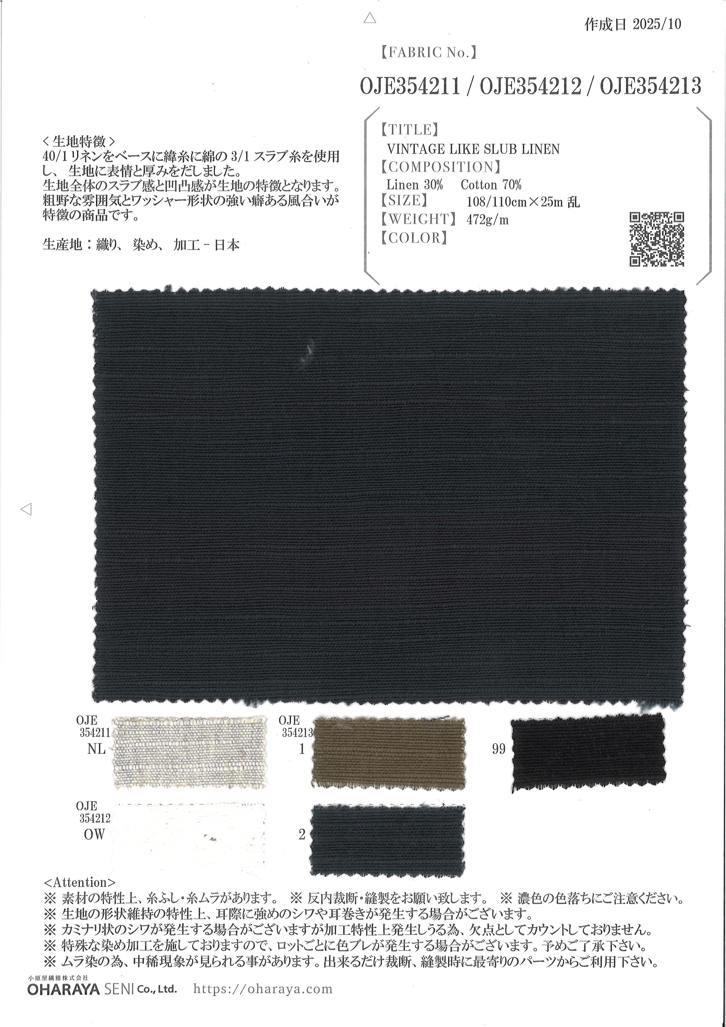 40/1リネンをベースに緯糸に綿の3/1スラブ糸を使用し、生地に表情と厚みをだしました。生地全体のスラブ感と凹凸感が生地の特徴となります。粗野な雰囲気とワッシャー形状の強い癖ある風合いが特徴の商品です。 |