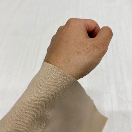 30番単糸のインド産シャンカール綿を使用したフライス素材です。均質で品位の高い原料を使うことで、肌当たりが柔らかく、伸び戻りの良い風合いに仕上げています。日本国内で丁寧に編立てを行っており、インナーからカットソーまで幅広いアイテムで上質な着心地を実感いただけます。