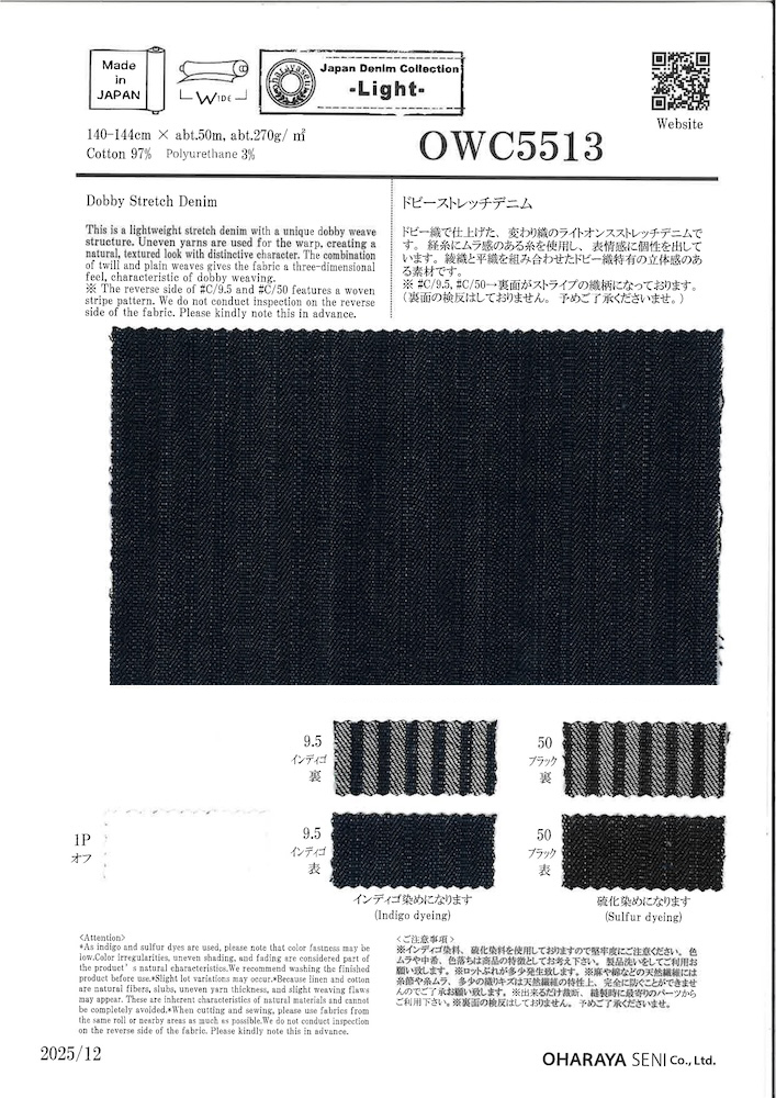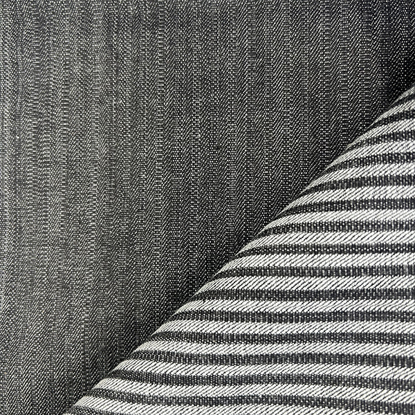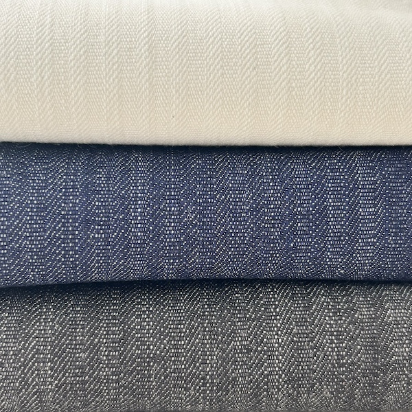 ドビー織で仕上げた、変わり織のライトオンスストレッチデニムです。経糸にムラ感のある糸を使用し、表情感に個性を出しています。 綾織と平織を組み合わせたドビー織特有の立体感のある素材です。